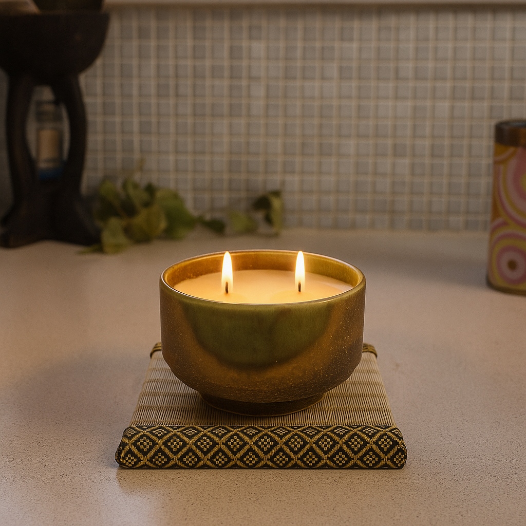 The ceramic bowl is finished in layered tones of earthen brown and moss green, recalling damp soil and finely ground matcha. Two cotton wicks sit within a generous pour of natural soy wax, producing a warm, even glow that softens the surface of the glaze without excess movement.
