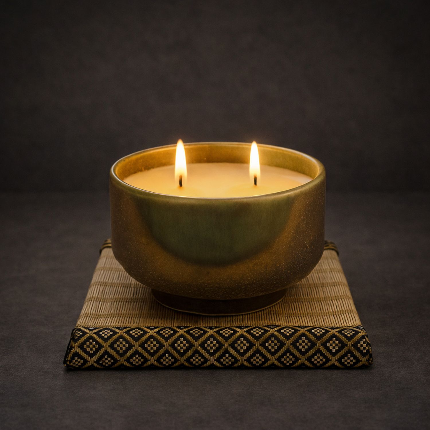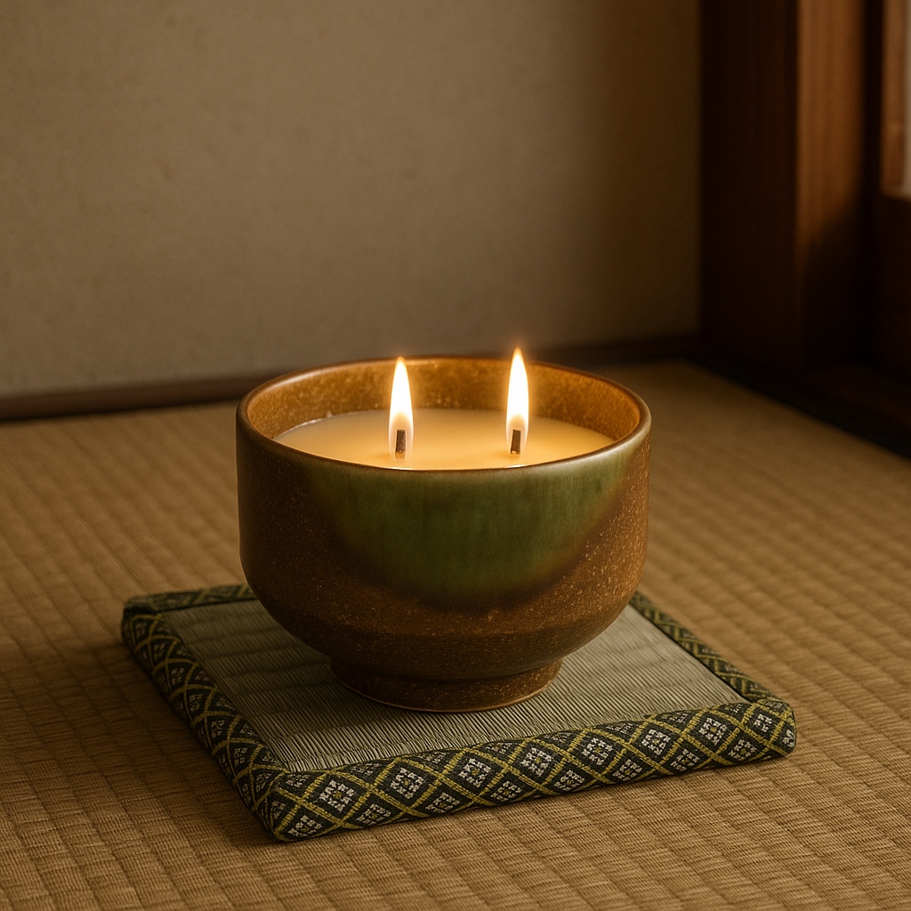A quiet homage to Japanese tea rituals, the Byakuro Candle Set reinterprets a handcrafted matcha bowl as a vessel of light. Resting on a traditional tatami mat woven from igusa straw, the piece is defined by proportion, texture, and restraint.