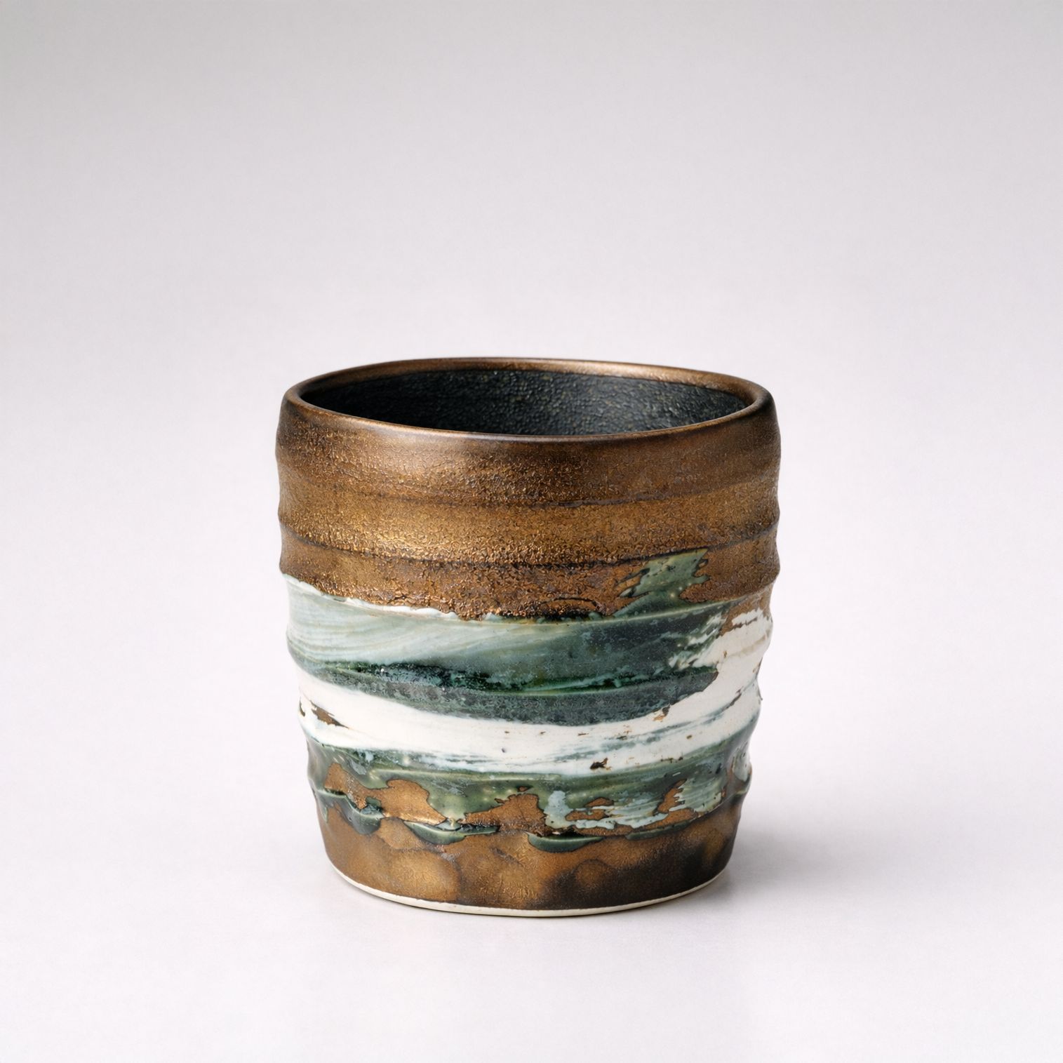 This clay cup features a softly tapered profile with gentle undulation through the body, creating a sense of movement without excess formality. Horizontal layers of glaze move around the surface in muted earth, mineral green, and soft off-white tones, settling naturally into the contours of the piece.