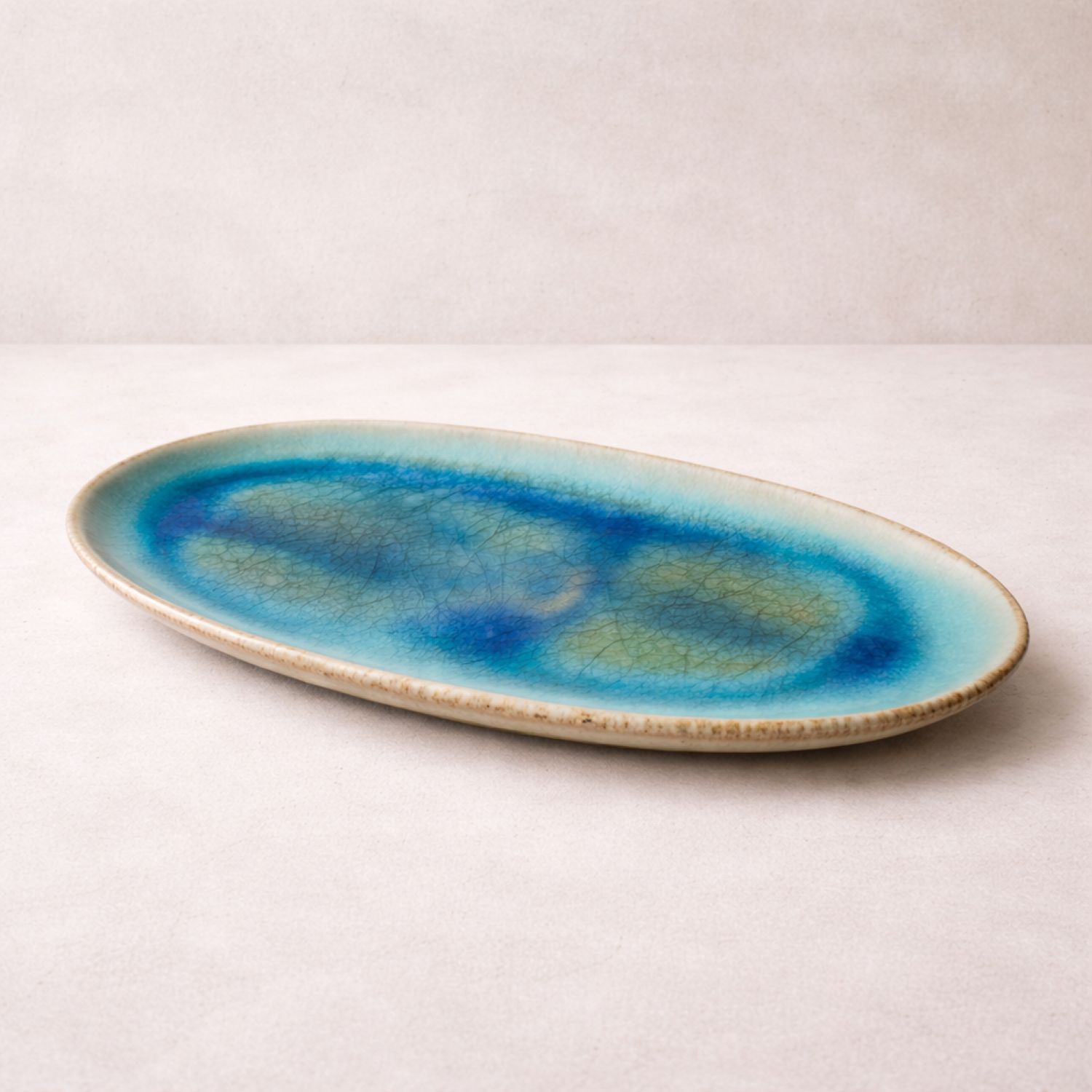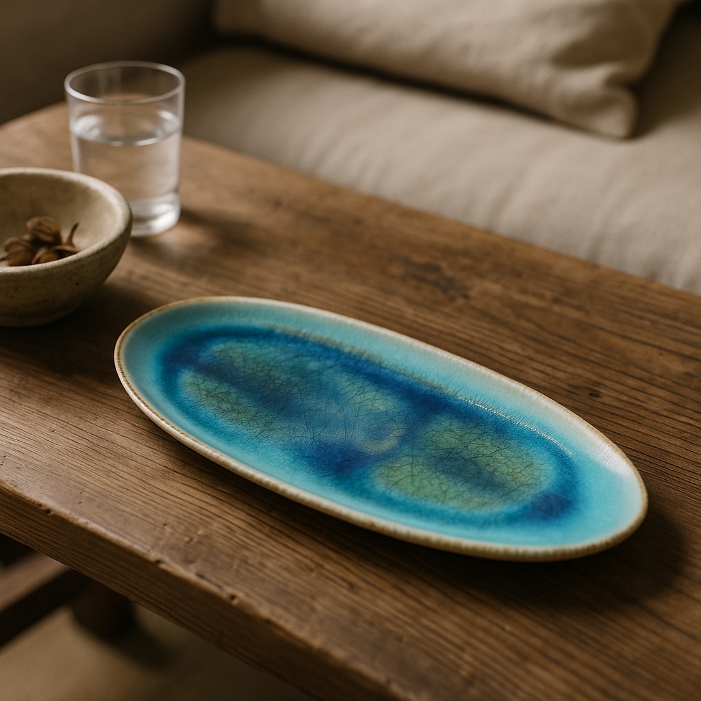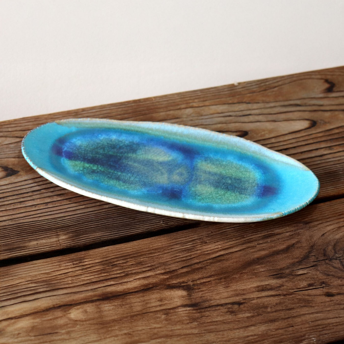 Inspired by the luminous shallows of Okinawa, this Mashiko-made dish combines pottery warmth with the brilliance of molten glass. Each piece is individually crafted, resulting in unique surface patterns that evoke rippling tides and sea glass hues. Perfect as a jewelry catch-all, tealight base, or sculptural accent on a wooden tray or linen console.