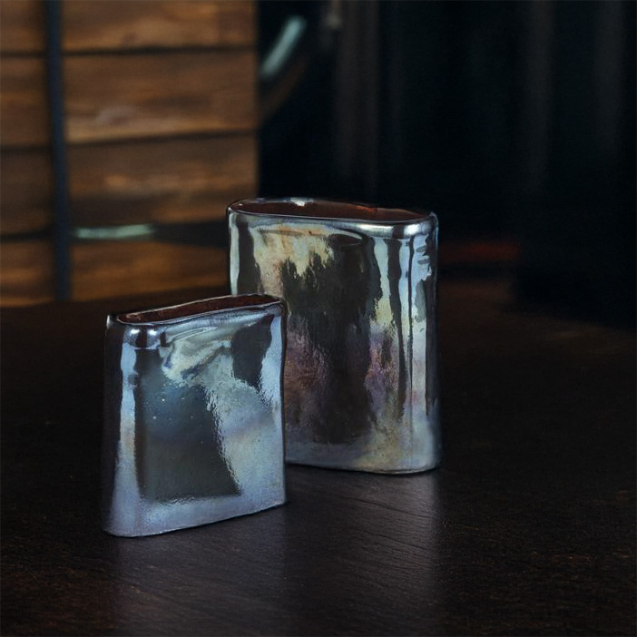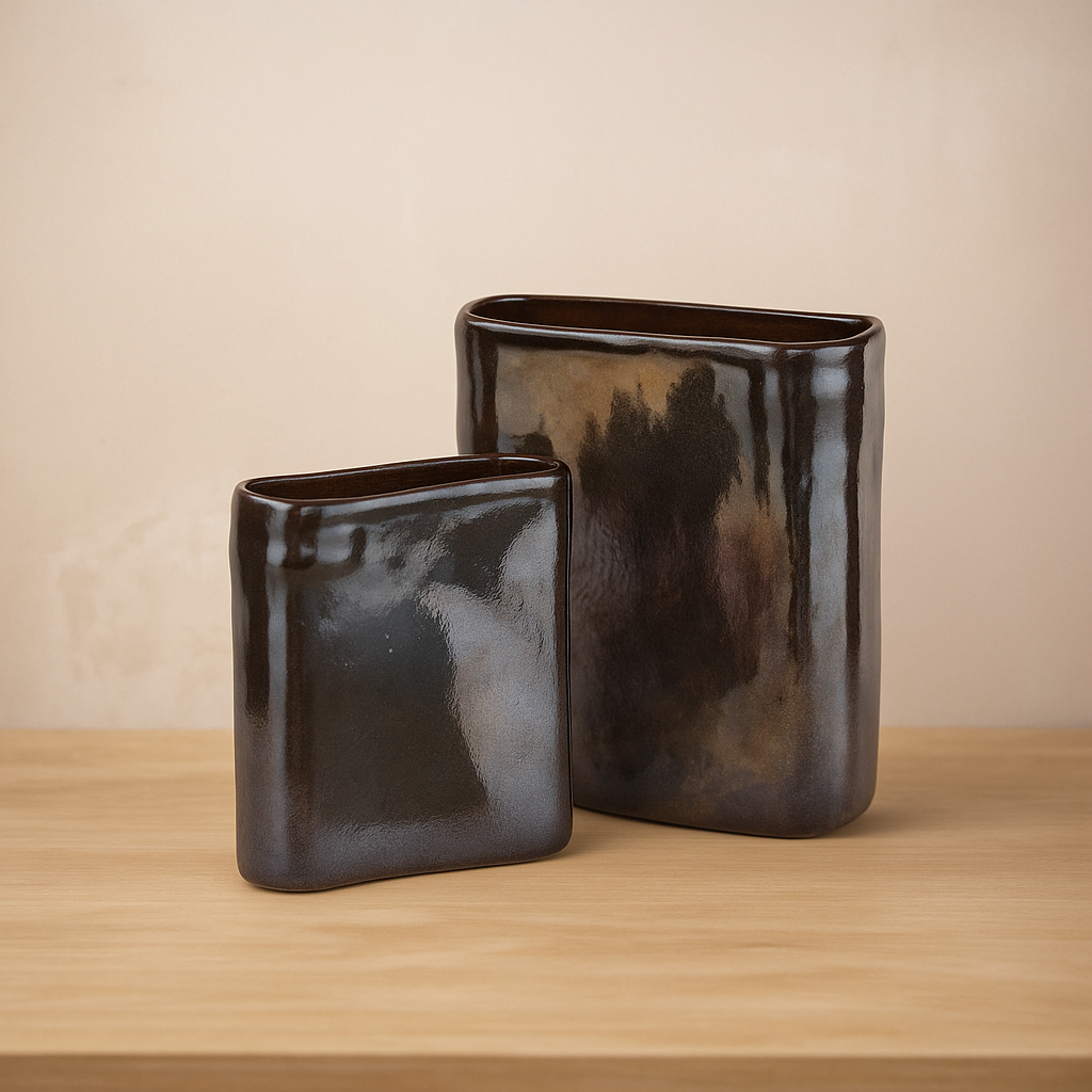 The Ryūkyū Kuro Glaze Duo reflects the quiet artistry of Okinawan ceramic traditions. Hand-shaped with subtly irregular forms, each vase is finished in a layered glaze that shifts from smoky browns to deep blacks, with reflective highlights that change under the light.