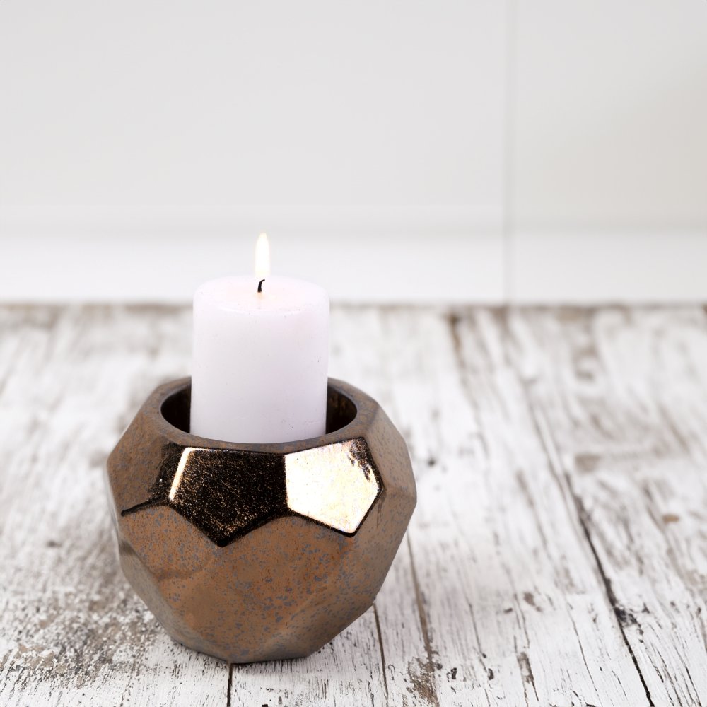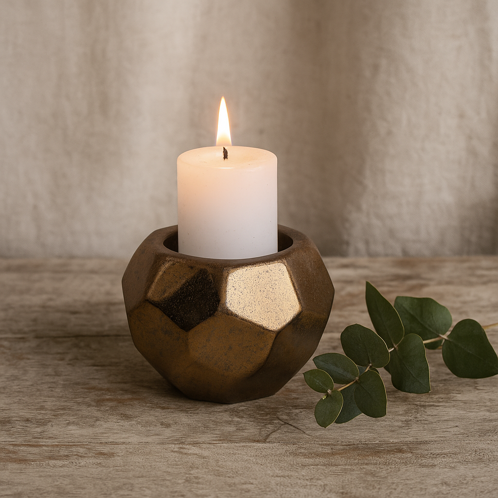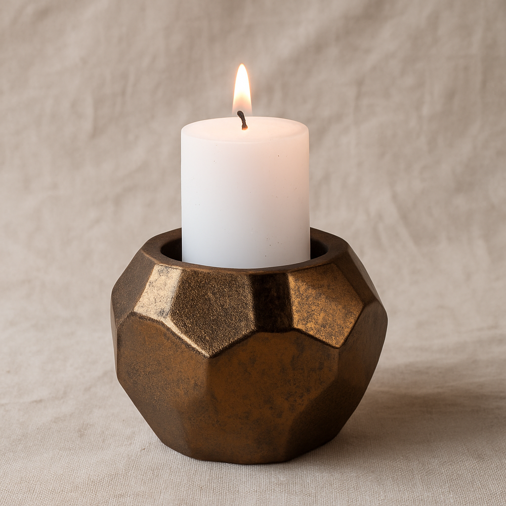 The Kintsugi Glow Candle Holder is a handcrafted ceramic piece finished in a radiant crystal gold glaze that shimmers with depth and texture. Its faceted geometric design reflects light in subtle variations, reminiscent of molten gold and timeless Japanese artistry. Measuring 14 × 11 cm (with 7 × 5 cm depth for a pillar candle), this piece creates a serene, inviting glow when lit, or stands alone as a sculptural accent. A balance of opulence and imperfection, it captures the Wabi-Sabi spirit—where beauty lies in simplicity and natural variation.
