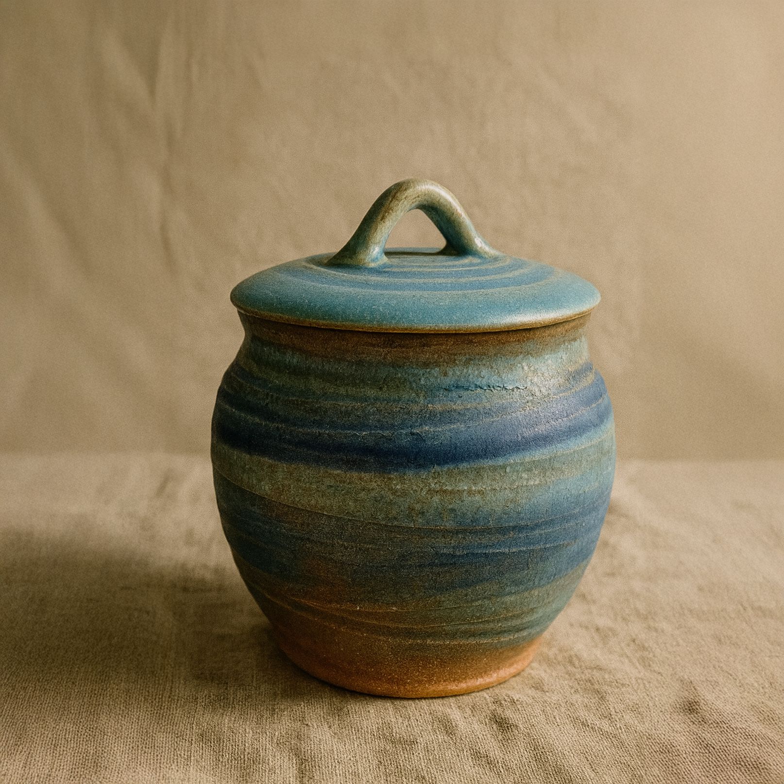 The Tidepool Lidded Jar captures the essence of the sea in ceramic form. Its compact silhouette is finished with layered glazes in shades of aqua, indigo, and earthy brown, evoking the depth and movement of tidal waters. A small looped handle tops the fitted lid, adding a functional yet artisanal touch.