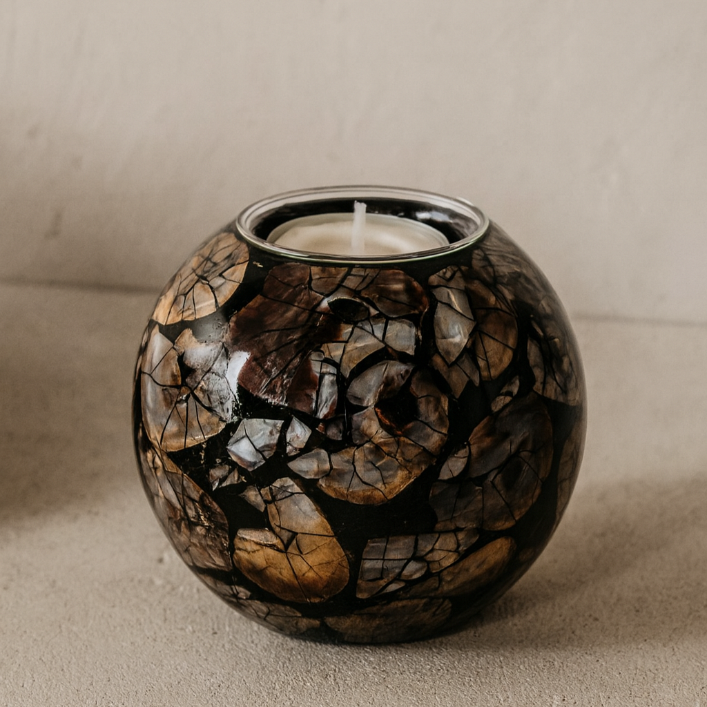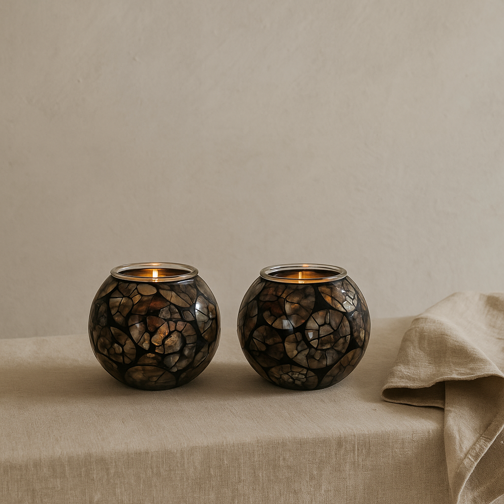 Handcrafted with natural shell inlays, the Nightfall Shell Mosaic Candle Holders create a striking interplay of shadow and light. Each fragment of shell is carefully placed, forming a unique mosaic that shimmers against a deep backdrop. Measuring 9 × 9 × 9 cm, this set of two holders transforms any room into a warm, contemplative space—perfect for home, restaurant, or boutique settings. The irregular patterns and organic textures embody the Wabi-Sabi philosophy of imperfect beauty, making each pair entirely unique.